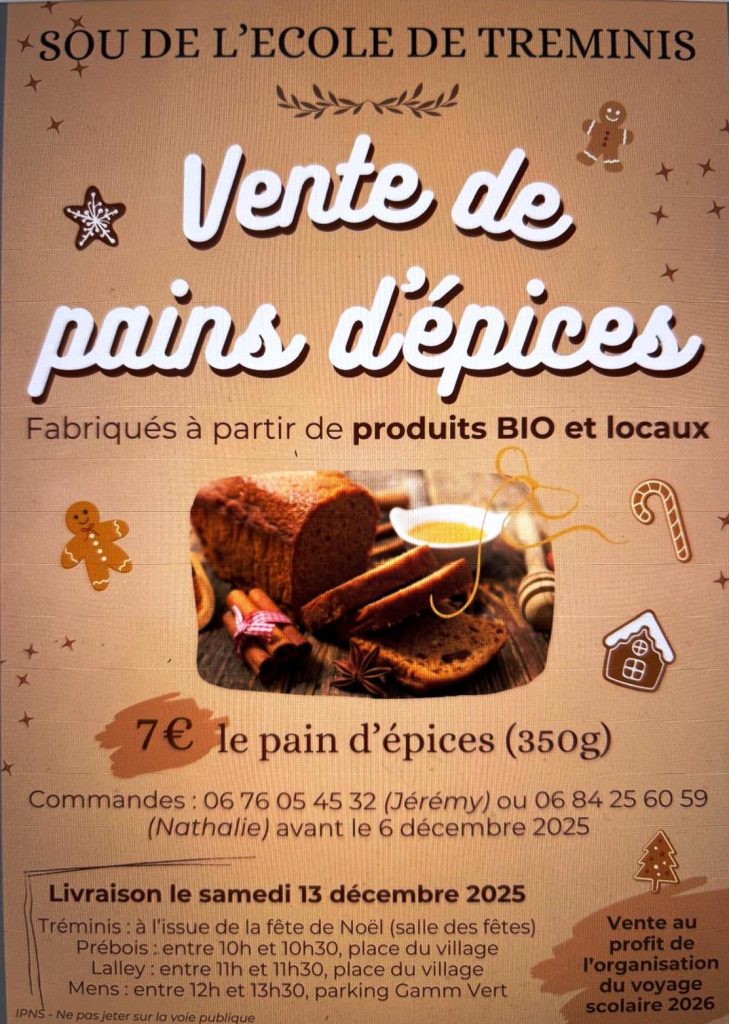Vente de pains d’épices par le Sou des écoles de Tréminis – commande avant le 06/12/2025