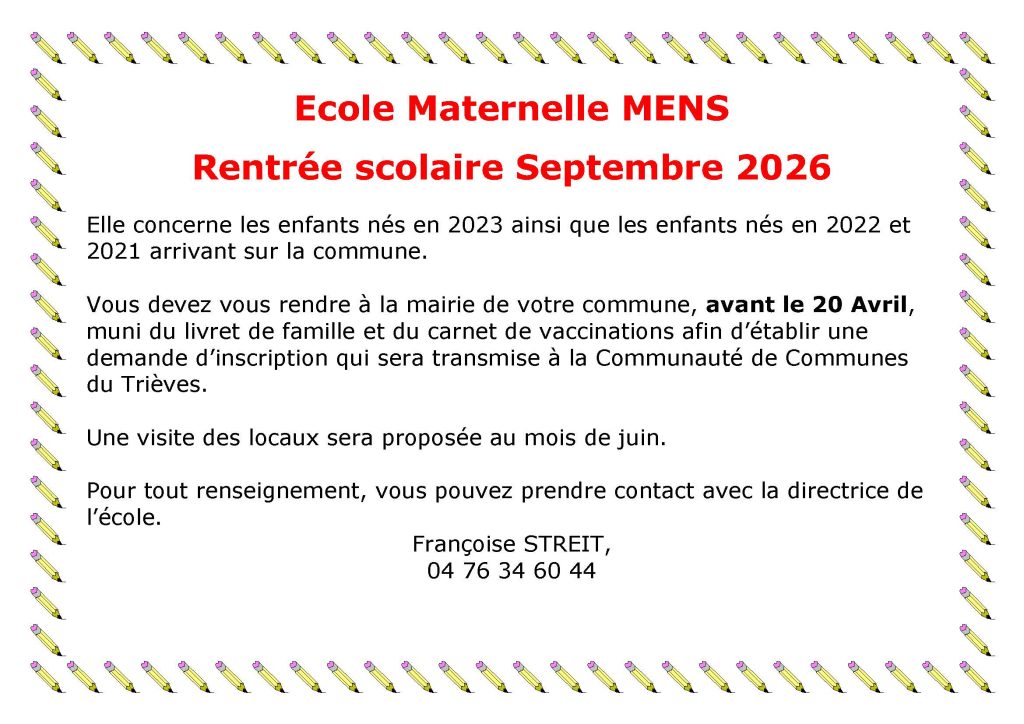 Inscriptions à l’école maternelle de Mens pour la rentrée 2026/2027