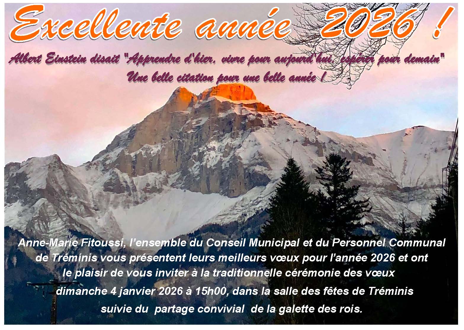 Anne-Marie Fitoussi, l’ensemble du Conseil Municipal et du Personnel Communal de Tréminis vous présentent leurs meilleurs vœux pour l’année 2026 et ont le plaisir de vous inviter à la traditionnelle cérémonie des vœux dimanche 4 janvier 2026 à 15h00, dans la salle des fêtes de Tréminis suivie du partage convivial de la galette des rois.
