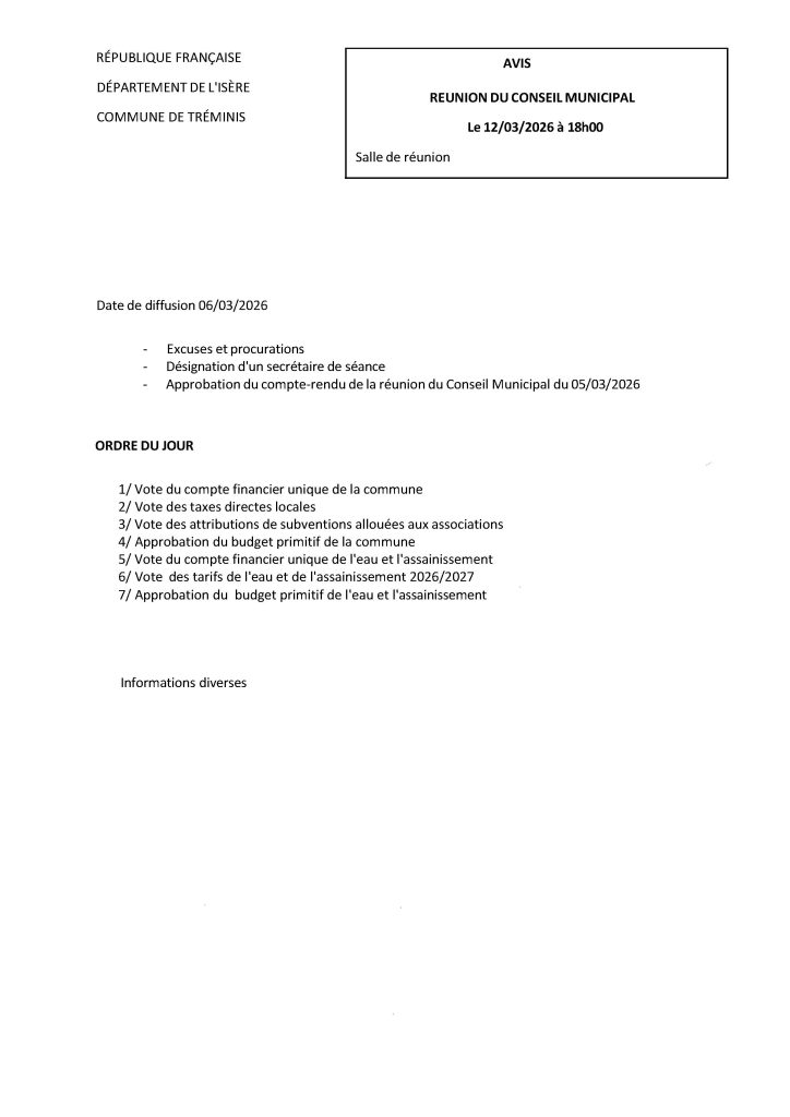 Prochain conseil municipal jeudi 12 mars 18h